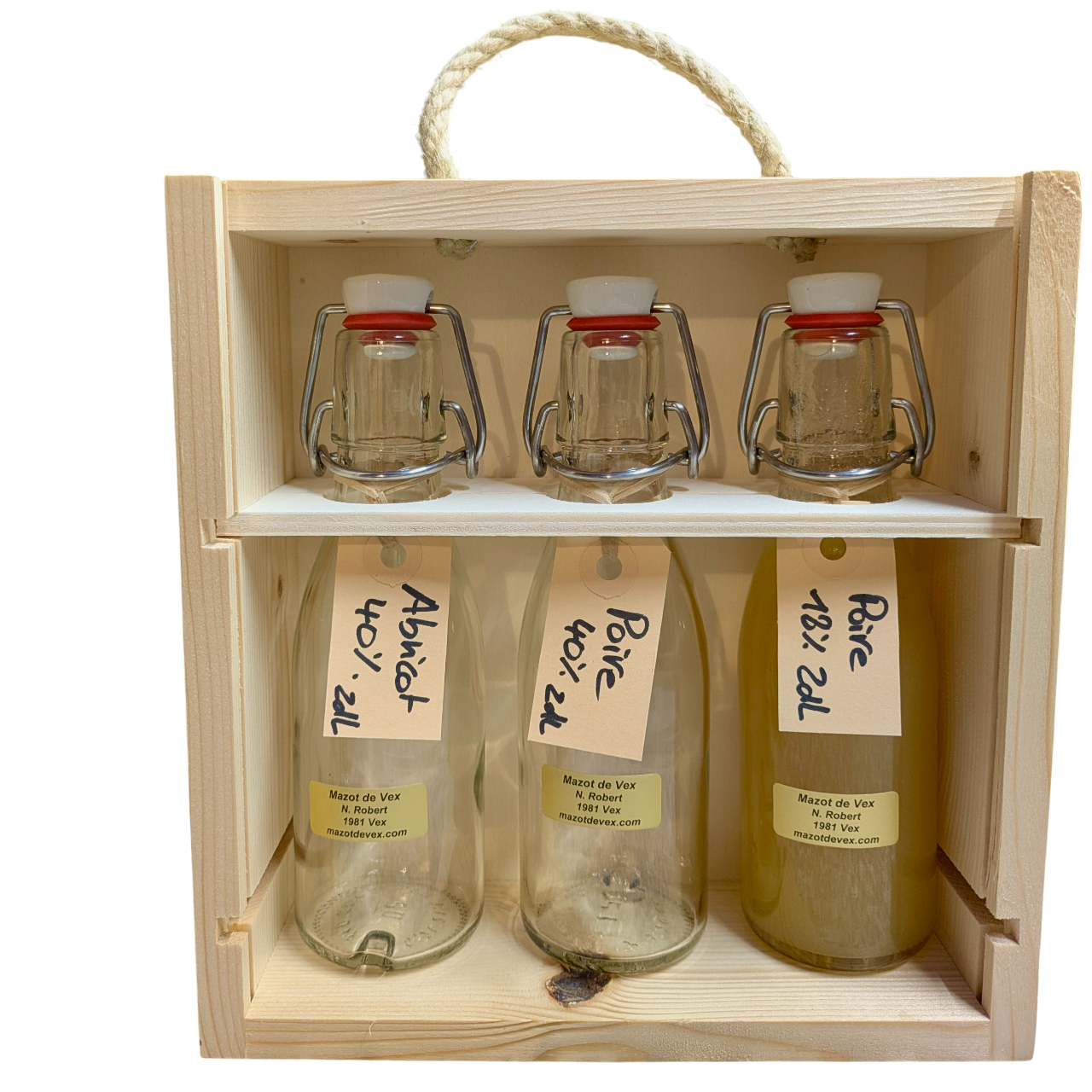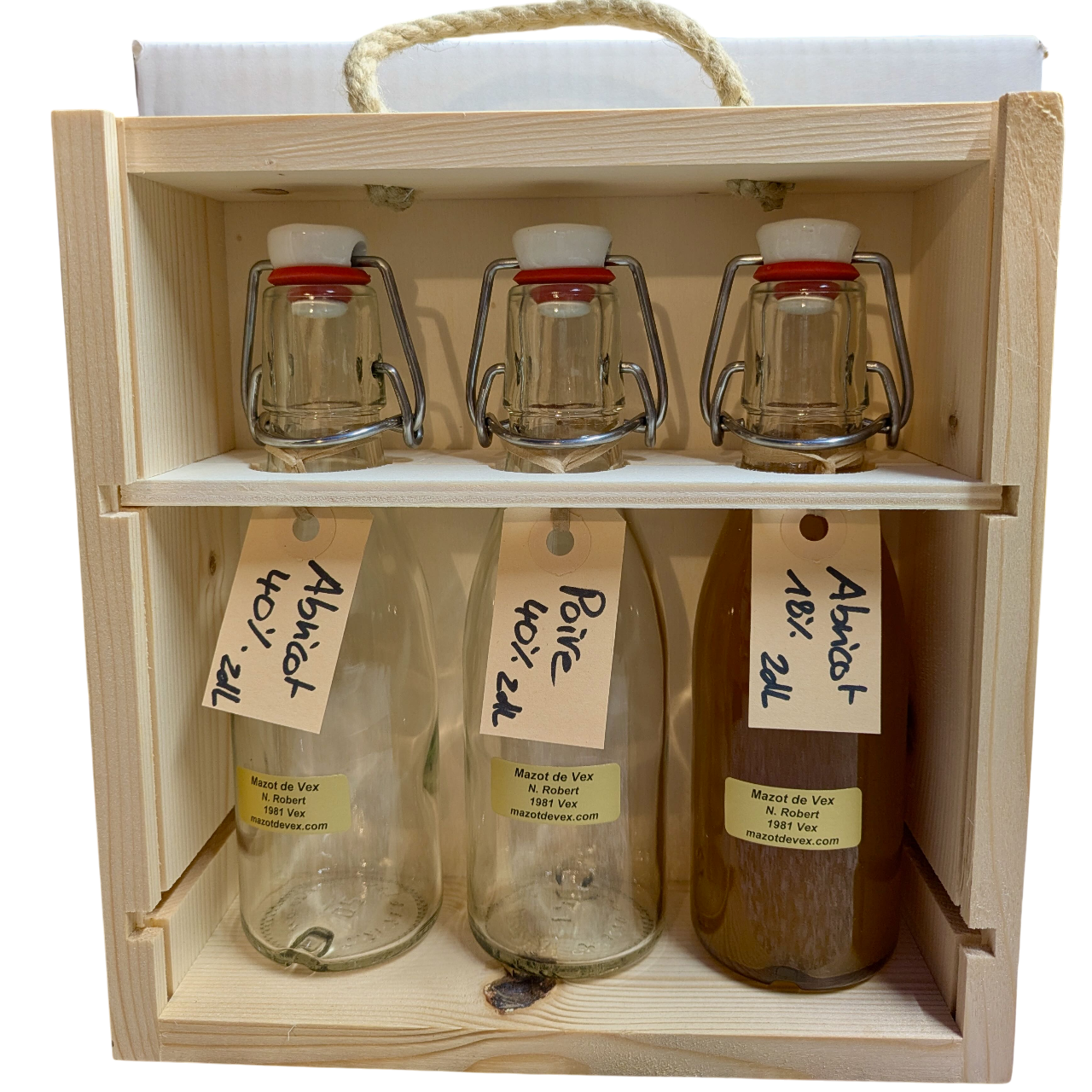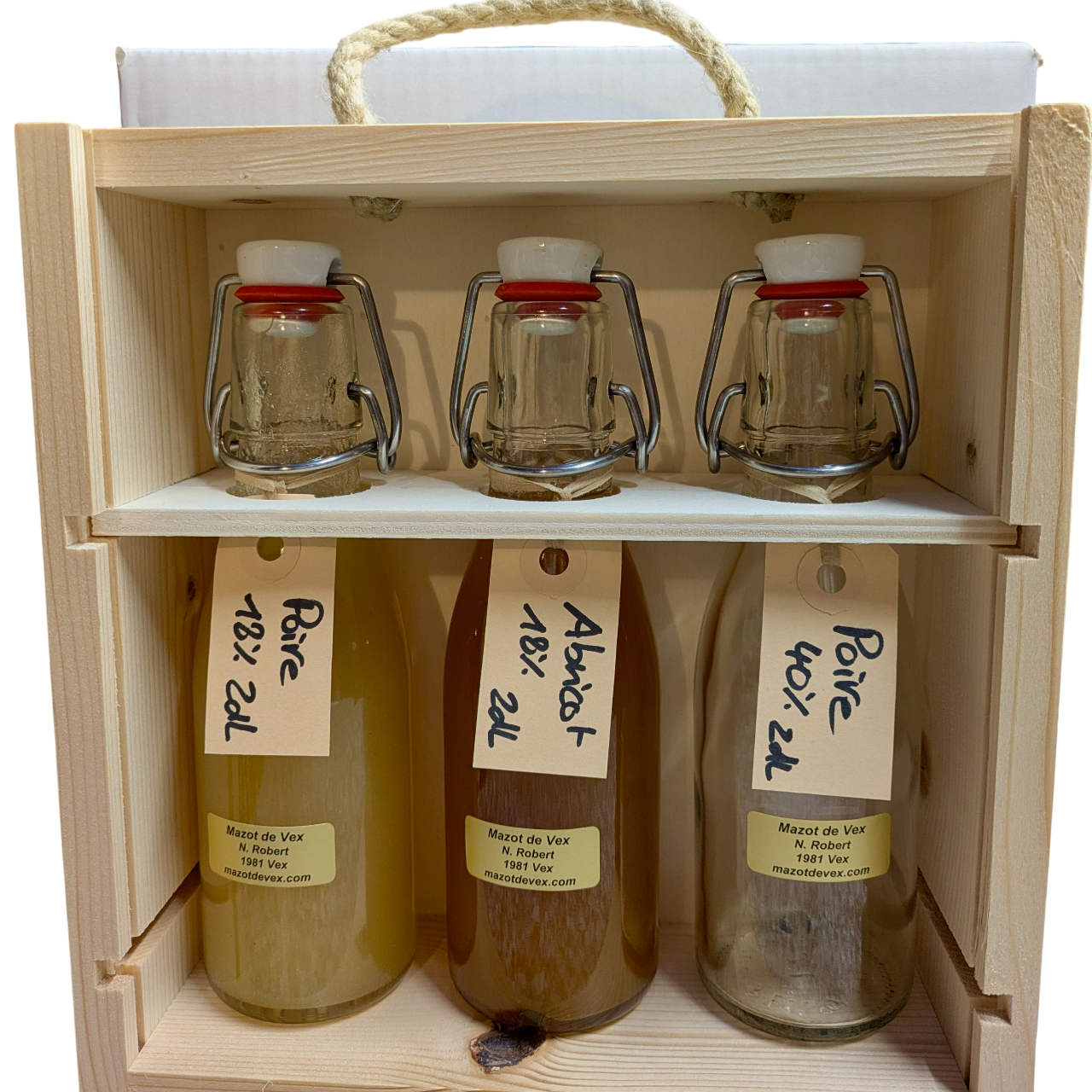 Coffret liqueur eau-de-vie contenant de la liqueur et de l’eau-de-vie d’abricot et/ou de poire du Valais dans trois bouteilles de 2dl mignonnettes. Idéal comme cadeau !